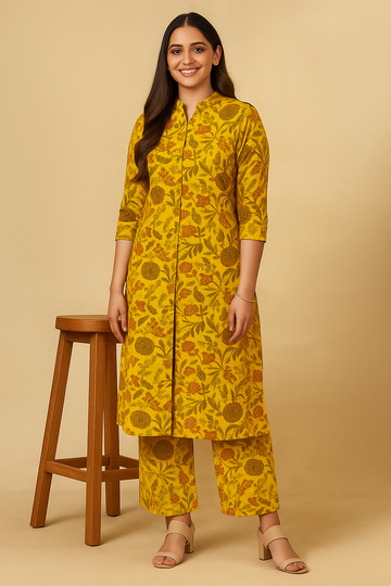 Mustard yellow Printed Cotton Kurti with Plazo – Two-Piece Set