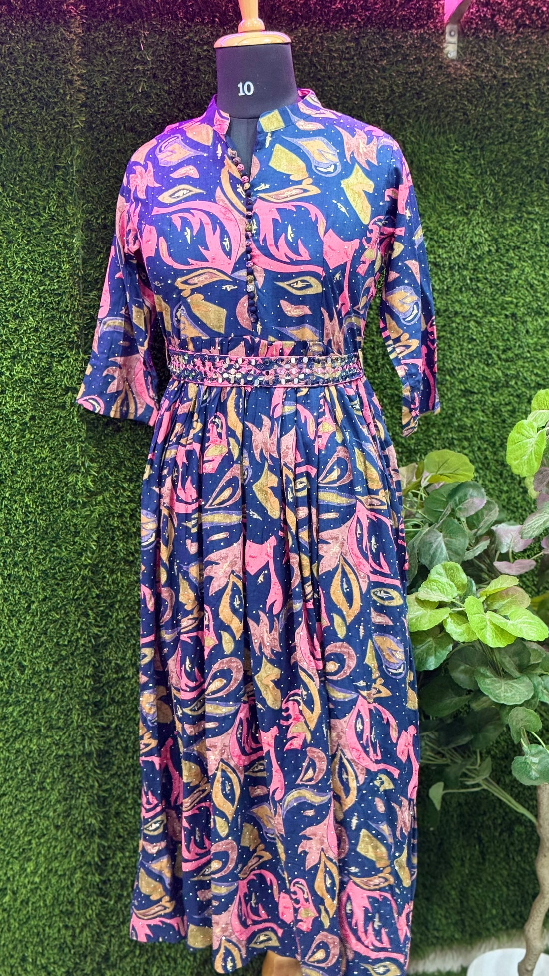 Turn heads with this stunning women’s printed maxi dress featuring intricate all-over stone work and...