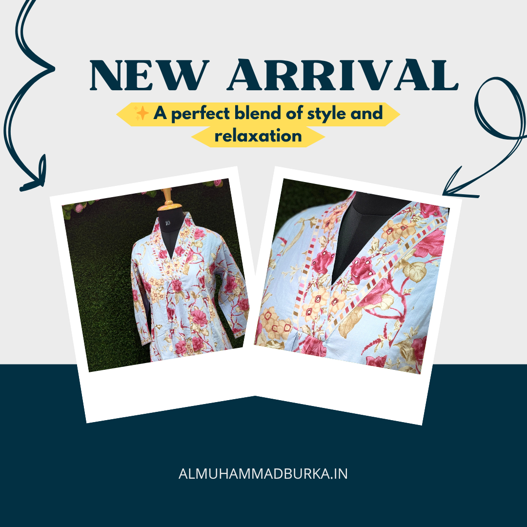 Light blue Floral Printed Cotton Kurti with Plazo – Two-Piece Set