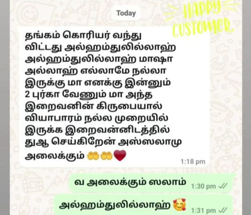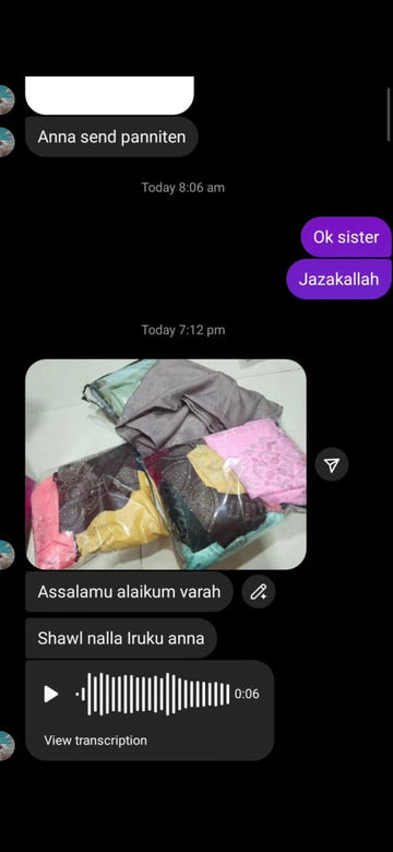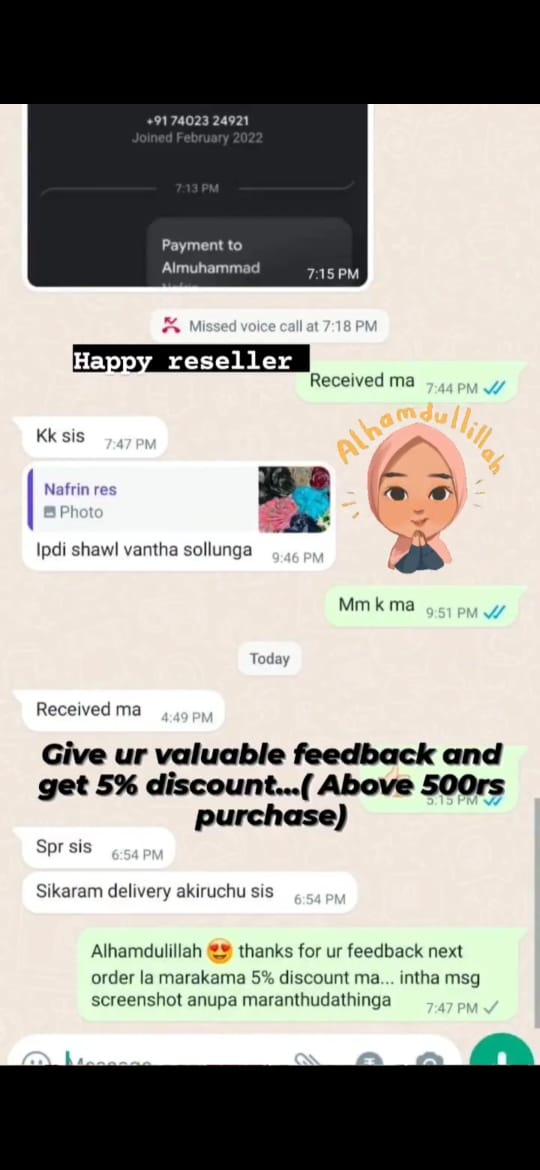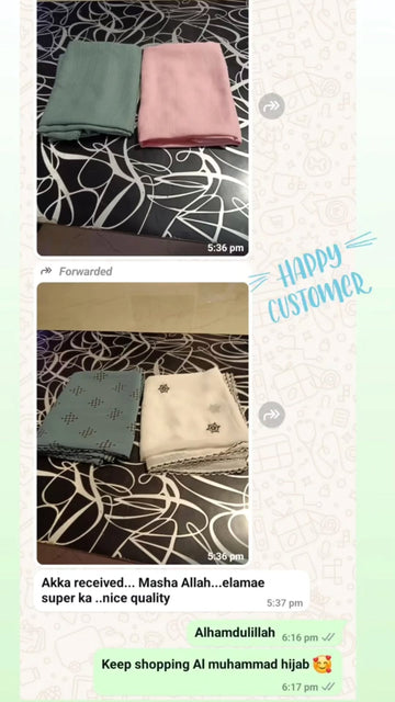 One of the Best abaya shop I have purchased in online...I never expected such a patience on showing the collections from the shop members...So calm and very patient on showing the collections which ever I asked... Thanks a lot Al-Muhammed Hijabs..May Allah enrich your business..🥰🥰..Offers are Vera level 😀😀