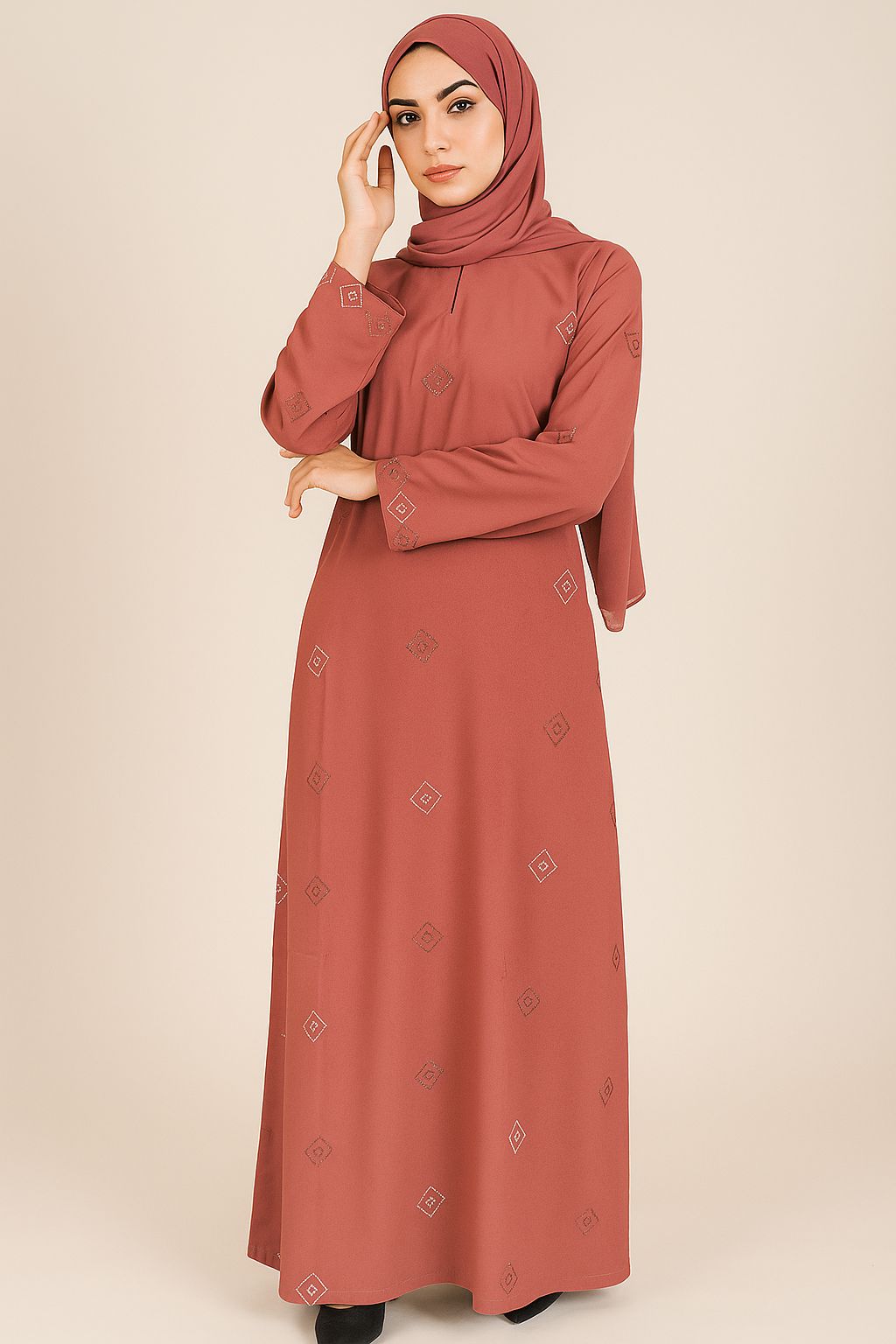 Elevate your modest wardrobe with our Classic Beige Embellished Abaya, a graceful fusion of simplicity...