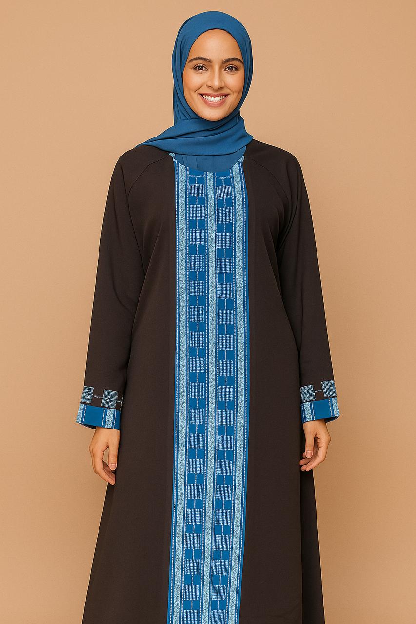 Make a statement with this sophisticated black abaya featuring a striking blue stonework center panel...