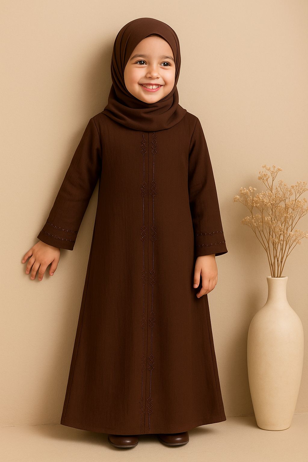 Kids Brown Abaya – Ruksar Fabric with Simple Stone Work