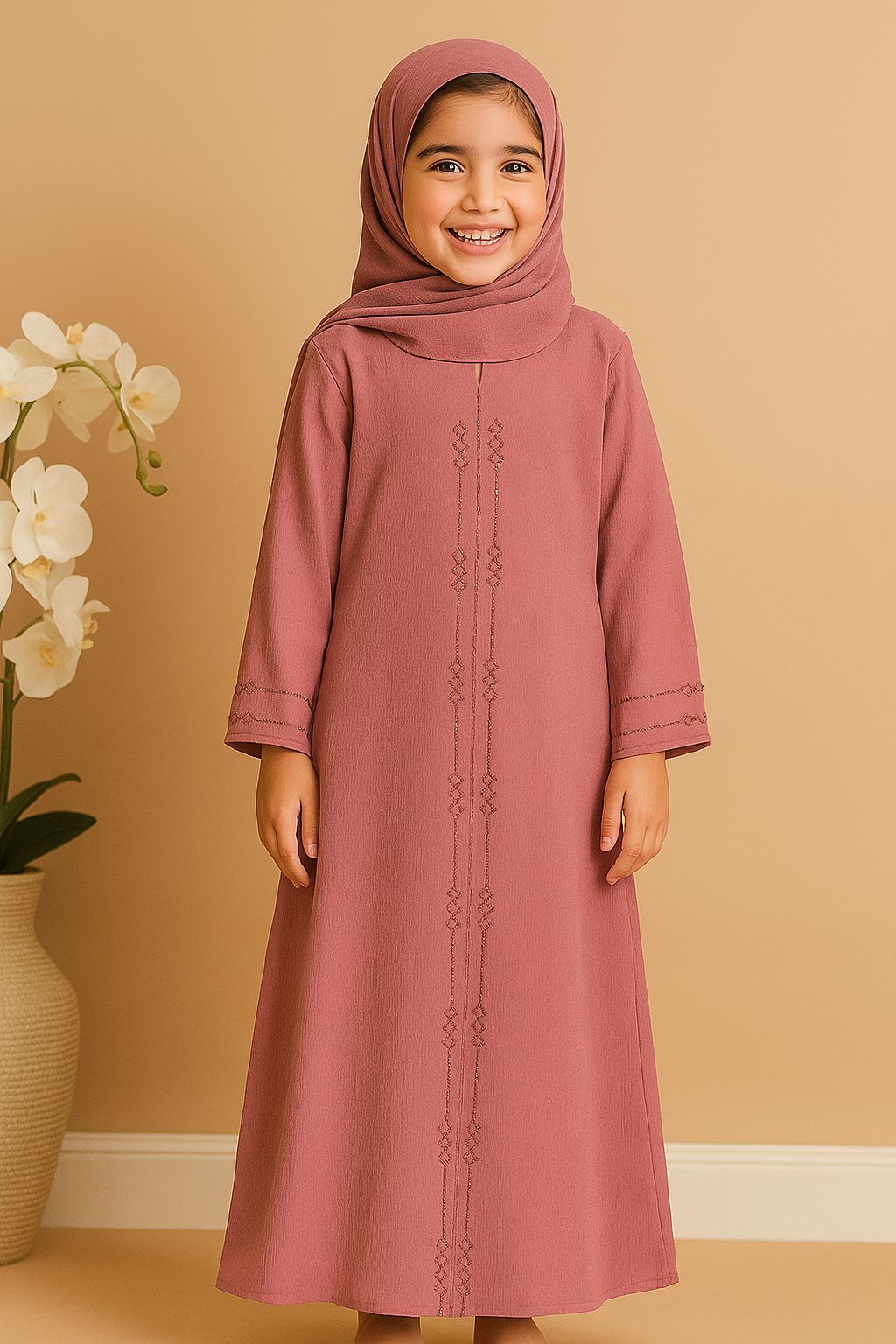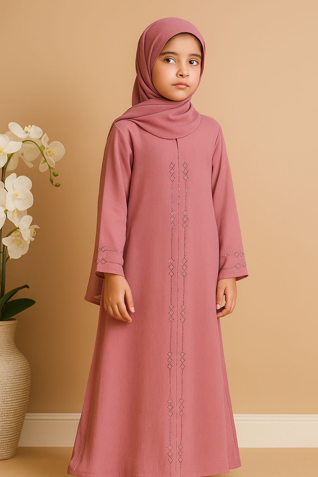 Kids Abaya-Dull Pink – Ruksar Fabric with Simple Stone Work
