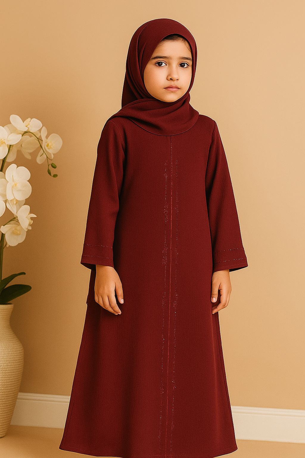 Kids Maroon Abaya – Ruksar Fabric with Simple Stone Work