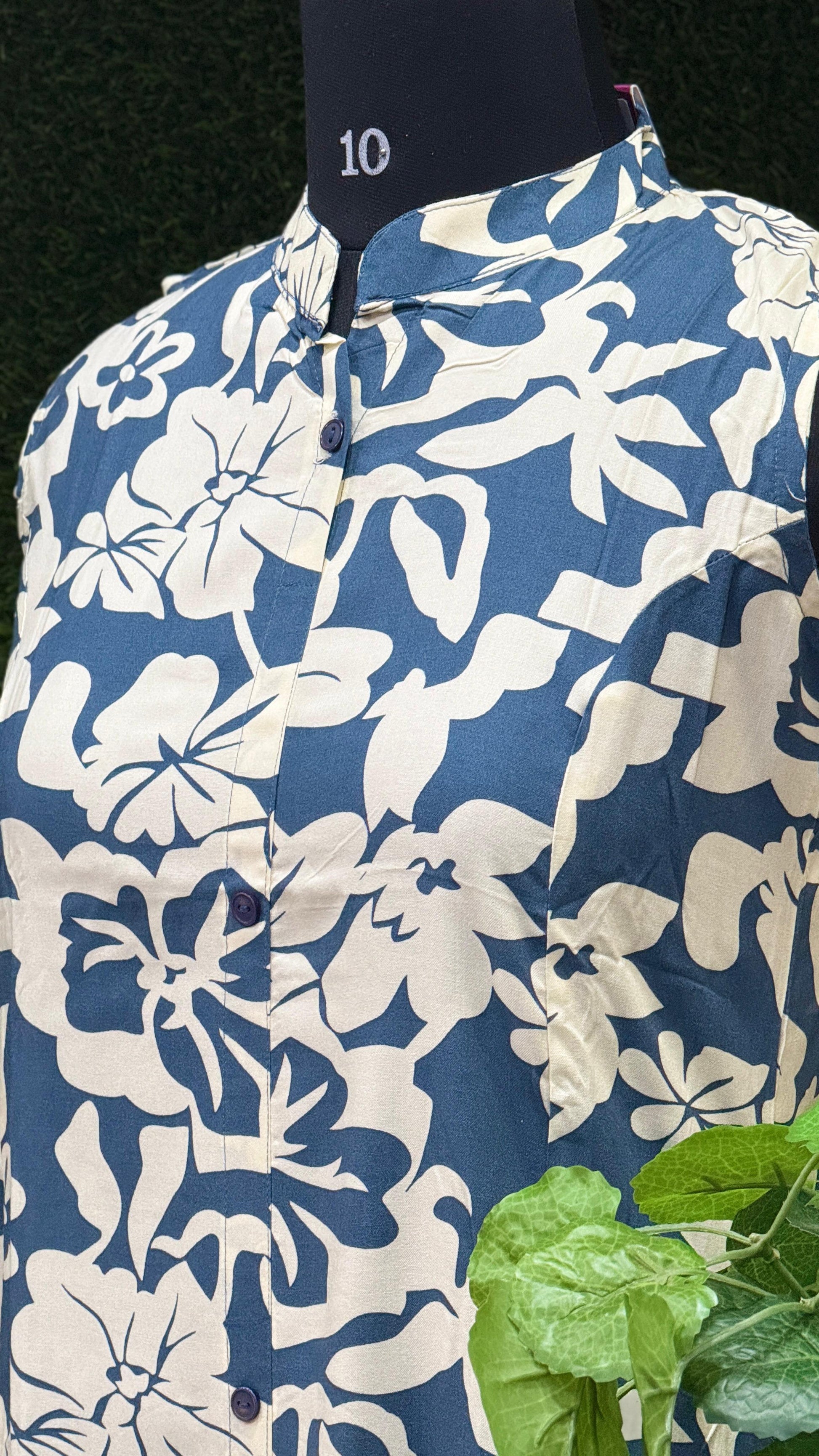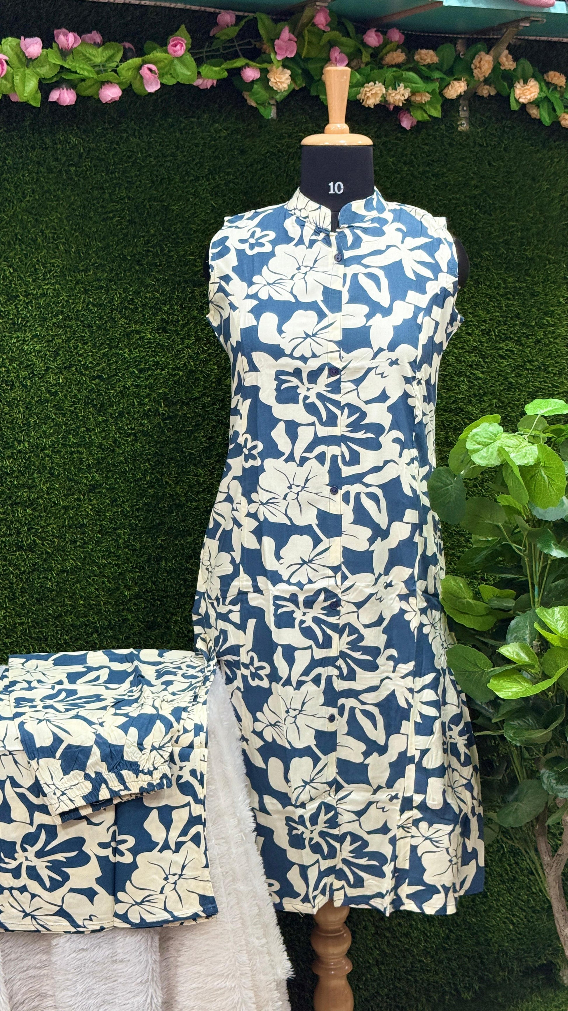 Elevate your wardrobe with this chic and comfortable rayon kurta and palazzo set, featuring an eye-catching floral design in navy blue and off-white. The soft rayon fabric offers a lightweight and breathable feel, perfect for all-day wear.