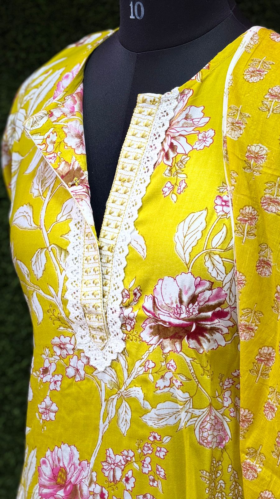 • 🌼 A-line Kurta with delicate white lace work and floral prints