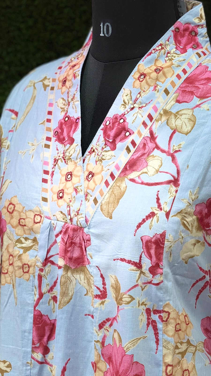 • Kurti: V-neck, floral print, three-fourth sleeves